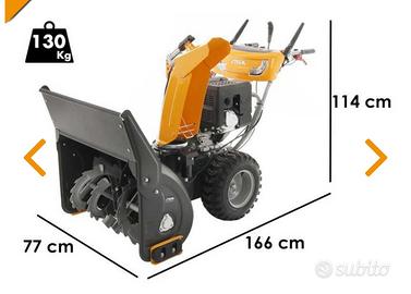 Vendo Stadi turbina bistadio, Alimentazione benzina, Modello Motore WS420, Cilindrata 420 cm', Potenza nominale 12 HP, Tipo cambio Idrostatico, Semovenza trazionata, Marce Illimitato, Larghezza fresa standard 72 cm, Tipo rotazione camino elettronico sul cruscotto, Inclinazione deflettore superiore camino elettronico sul cruscotto, Tipo di Ruote pneumatiche.