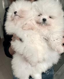 Vendo cuccioli di Spitz bianchi , due maschietti piccolissimi,hanno due mesi di vita , già fatta seconda sverminazione e secondo vaccino . I genitori visibili insieme ai cuccioli hanno un peso di 2 kg .entrambi con pedigree ed entrambi bianchi puri .I piccoli crescono in casa , hanno cominciato lo svezzamento e cominciano ad usare la traversina. Verranno consegnati a tre mesi , quindi i primi di marzo , con libretto sanitario completo e pedigree. Il prezzo in privato no perdi tempo