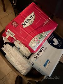 Vendesi strisce assorbenti per incontinenza anziani, serenity e serenity light, super assorbenza. 1 scatolone 8 pacchi per 30 assorbenti e 8 pacchi rosa e 5 bianchi.