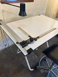 Tecnigrafo da disegno, uso anche come scrivania regolabile in altezza ed inclinazione, completo di sgabello con struttura in acciaio, appoggia piedi e seduta e schienale in pelle