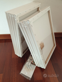 Set di 10 tele per pittura con telaio cm. 30x40. N° 10 pennelli assortiti pelo di capra punta tonda, marca Borgione. TUTTO NUOVO in confezione sigillata.