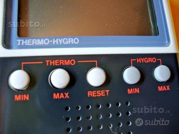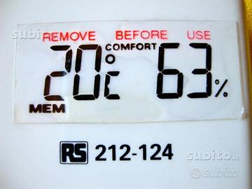 Termoigrometro digitale. Strumento economico con supporto integrato che registra i valori min/max e indica condizioni di UR scarsa o confortevole. Alimentato da 2 batterie AAA (non fornite).