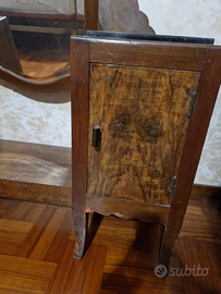 Toletta d'epoca in stile vintage, dotata di specchiera, due ripiani laterali in marmo e vani portaoggetti sottostanti.