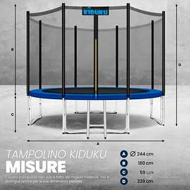 Trampolino elastico KIDUKU TPLS BFT diametro cm 244, completo di tutti gli accessori ed istruzioni in italiano, fornito smontato negli imballaggi originali, per esterno, portata 80 kg, comprato nel 2025, da ritirare sul posto, peso 40 kg