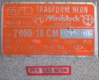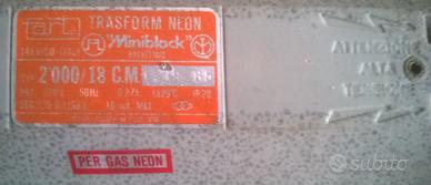 Trasformatore per Insegne Neon F.A.R.T. Miniblock 2000/18 Vintage Non testato Descrizione: Marca F.A.R.T. (Treviso, Italy), modello Miniblock. o Specifiche: Tipo 2000/18 C.M. o Input: 220V 50Hz. o Output: 1.15 kV - 0 - 1.15 kV, 18 mA Max. Dimensioni circa 26 x 7,3 x 4,5 cm Peso circa 2090 g Condizioni: Oggetto vintage in buone condizioni estetiche (come da foto). usato, non testato. Ideale per riparazioni di insegne d'epoca, collezionisti o progetti artistici. Visto il peso dell'oggetto, ritiro a mano.