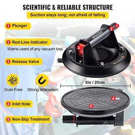 Ventosa a Sollevamento per Vetro da 100kg Ventosa per Piastrelle in Ceramica da 20,3cm a Colore Nero, Ventosa con Straccio per Pulizia Custodia in Plastica per Marmo, Piastrelle, Pietra, ecc. Capacità di Carico di 100 kg: questa ventosa a sollevamento per vetro ha un pad piatto da 8 pollici. Può aspirare carichi di 100kg e viene fornito con una custodia per il trasporto.