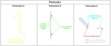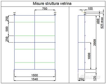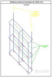 Vendo struttura metallica per arredo allestimento vetrina per negozio o ufficio. La struttura è stata realizzata su misura dal fabbro secondo le specifiche tecniche dei disegni qui allegati. Delle astine sporgenti verso l'alto servono a fissare la struttura al soffitto in modo da ancorarla. La struttura è verniciata spray acrilico colore bianco scuro opaco, ma potreste colorarla di altro colore. I piedini sono regolabili in altezza. Le aste posteriori sono rimovibili per permettere l'allestimento. Incluso nel prezzo vi diamo anche i vetri sufficientemente spessi per alloggiare anche cose pesanti.