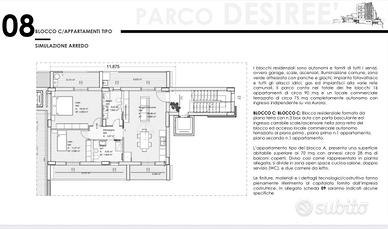 Ogni unità abitativa, di circa 100 mq, è composta da tre camere da letto, due bagni, ampia cucina e luminoso salone con accesso diretto .