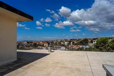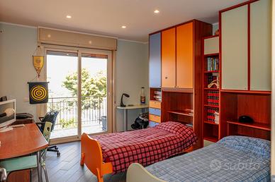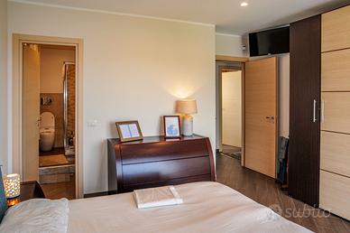 ingresso su disimpegno, ampia zona living soggiorno/cucina, 4 camere da letto, di cui una con bagno in camera, ulteriore bagno con box, ripostiglio, lavanderia interna con wc, tutti gli ambienti si affacciano su dei balconi panoramici con tripla esposizione Nord-Ovest-Est.