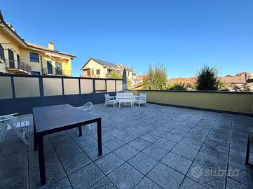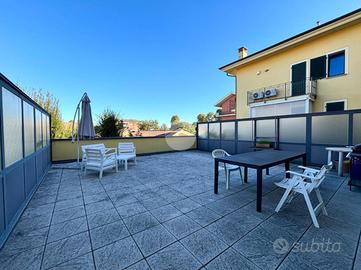 L'ingresso si apre su una luminosa zona giorno living con cucina abitabile, affacciata su balcone e grande terrazzo vivibile, perfetto per essere sfruttato tutto l'anno grazie alle tende da sole automatizzate.