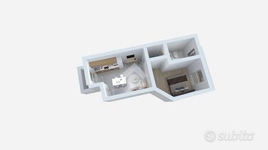 La zona notte comprende un bagno finestrato con doccia e una camera da letto matrimoniale con affaccio su un secondo balcone.