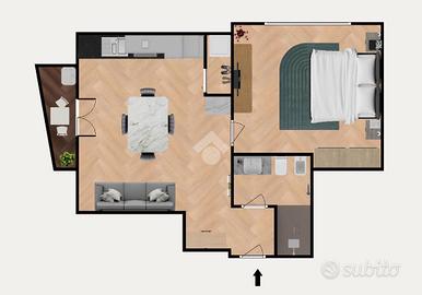 La disposizione comprende due locali, tra cui un soggiorno con angolo cottura, una camera da letto e un bagno moderno dotato di box doccia.