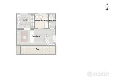 Attualmente l'immobile è composto da un luminoso soggiorno con predisposizione per l'angolo cottura e una spaziosa camera matrimoniale (da separare con un semplice tramezzo), un pratico ripostiglio finestrato e un ampio bagno finestrato con doccia.