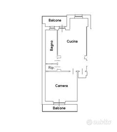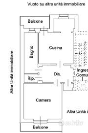L'ingresso si apre su un ampio corridoio che conduce al salone con angolo cottura in cui è presente l'accesso al balcone con vista aperta sul Castello di Avigliana. Gli spazi abitativi comprendono anche una camera matrimoniale con accesso al secondo balcone ed un ripostiglio. A completare la funzionalità dell'appartamento una lavanderia ed un bagno finestrato in cui è stata studiata un ampia doccia.