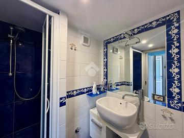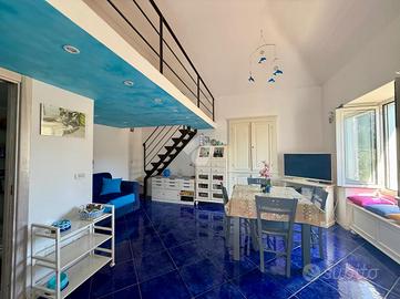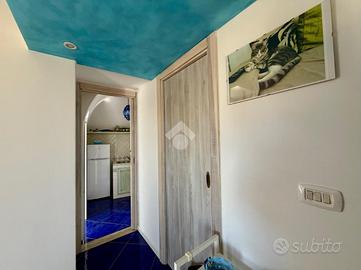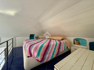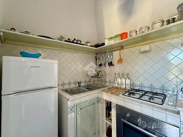 l'ambiente interno è ottimizzato con un angolo cottura funzionale e un soggiorno luminoso dove è presente la camera soppalcata, che aggiunge verticalità e prezioso spazio extra. Il bagno, anch'esso rinnovato con stile curato e raffinato, completa la zona interna.