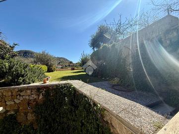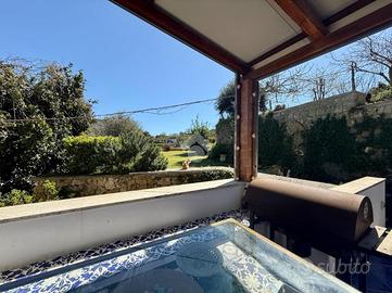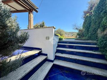 Entrando dall'ingresso e tramite poche scale si arriva al terrazzo esterno coperto, e due porte una per accedere alla cucina e uno per il salotto;