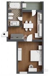 L'appartamento presenta una disposizione interna funzionale: l'ingresso conduce direttamente nella zona giorno con cucina, poi abbiamo la camera da letto e infine il bagno ampio completo di finestra. Completa un balcone, accessibile dalla cucina, che garantisce luminosità e ariosità agli ambienti.