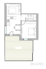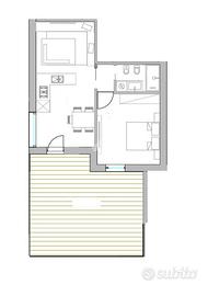L'appartamento, situato al primo piano, presenta una divisione degli ambienti funzionale. La zona giorno in open space è luminosa e da accesso a un ampio terrazzo privato, perfetto per rilassarsi all'aperto. La camera matrimoniale, di generose metrature, è spaziosa e accogliente, e il bagno è moderno e ben rifinito, garantendo praticità e comfort.