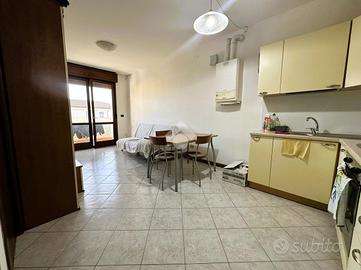 L'appartamento è composto da un luminoso soggiorno con cucina in open space che si affaccia su un balcone, camera matrimoniale e bagno con doccia.