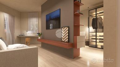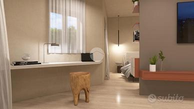 Facciamo il nostro ingresso nel corridoio che ci conduce nella zona giorno composta da cucina e soggiorno open space, camera da letto matrimoniale, e bagno finestrato con doccia.