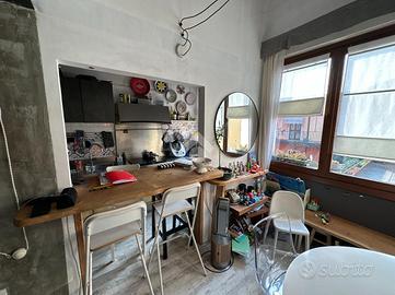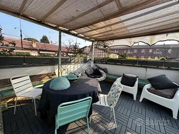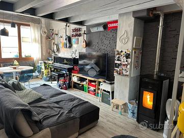 MOMPIANO in posizione comoda ai servizi ed all'interno di un contesto tranquillo, si propone in vendita appartamento con esclusiva terrazza privata. Sito al primo ed ultimo piano l'immobile è caratterizzato dall'ingresso privato direttamente nella terrazza di pertinenza, avente una superficie di circa 60 mq. L'appartamento caratterizzato dalla buona metratura dei suoi locali interni si sviluppa su due livelli, al piano inferiore dall'ingresso si accede direttamente all'ampia zona giorno con angolo cottura parzialmente separato dal soggiorno, completano il piano un disbrigo con attacchi lavatrice ed il bagno con antibagno; tramite una scala interna si accede al piano superiore soppalcato dove si trova la camera da letto matrimoniale con accesso al secondo bagno dell'abitazione oltre ad un comodo ripostiglio. Le travi a vista valorizzano l'esclusivo appartamento. Attualmente una pratica stufa a pellet riscalda l'appartamento, è presente la predisposizione per un classico riscaldamento a radiatori oltre ad uno split di aria condizionata nella zona notte. Di pertinenza esclusiva un'autorimessa singola all'interno della corte.