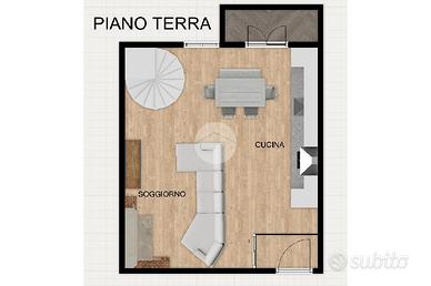 Una scala a chiocciola conduce al piano superiore, dove si trova una generosa camera matrimoniale, luminosa e con metrature tali da consentire la realizzazione di una cabina armadio, uno studio o una zona relax.