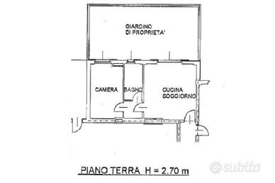 L'immobile è composto da luminoso soggiorno con cucina a vista e uscita sul giardino privato, camera da letto con parquet e finestra, servizio finestrato dotato di vasca da bagno.