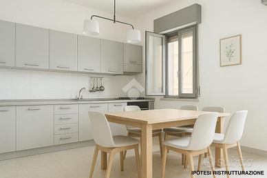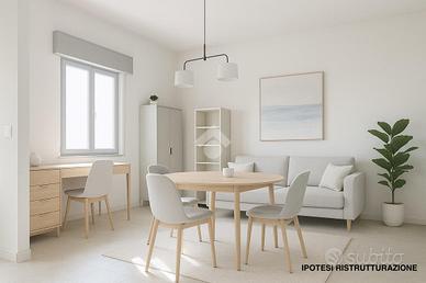 L'ingresso si apre su un soggiorno finestrato, che conserva ancora la vecchia vetrina con saracinesca sul lato strada, un elemento che testimonia la precedente destinazione d'uso e offre interessanti spunti per una ristrutturazione personalizzata.
