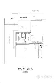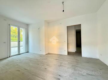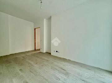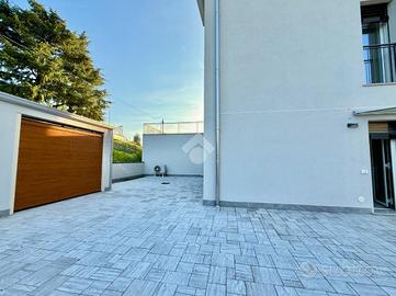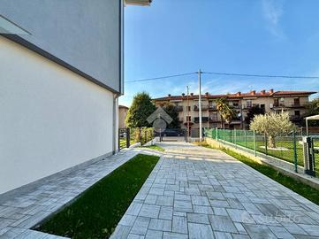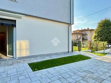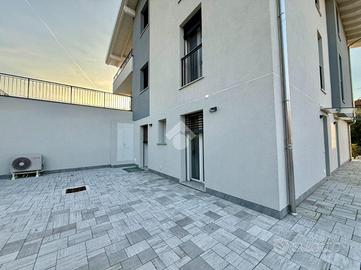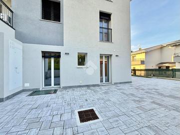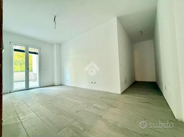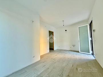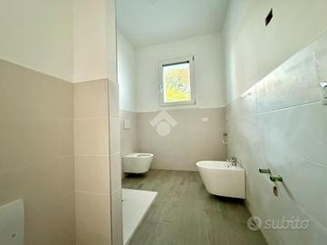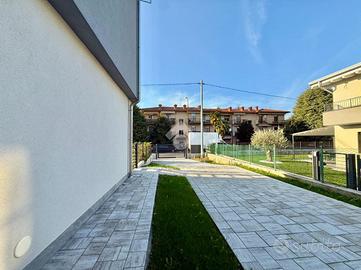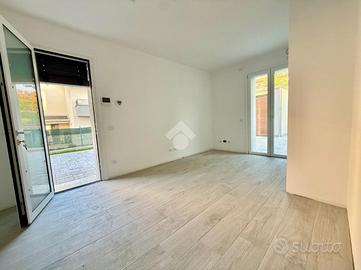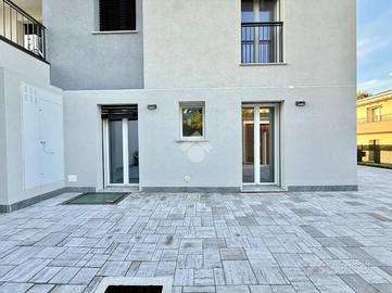 Al piano terra con ingresso indipendente troviamo moderno bilocale di 53 mq con spazio esterno privato piastrellato.