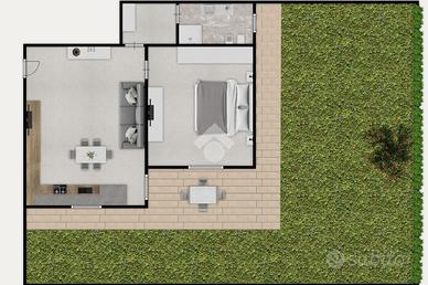 L'ingresso si apre su una luminosa zona living con soggiorno e cucina a vista, uno spazio confortevole e ben organizzato, con accesso diretto al giardino privato. L'area esterna, dotata di impianto di illuminazione, è ideale per momenti di relax all'aperto durante la bella stagione.