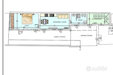 Ingresso in soggiorno con cucina a vista, ampia camera matrimoniale, entrambi con accesso diretto al giardino, e bagno con finestra.