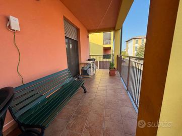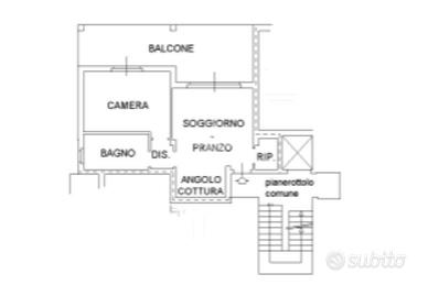 L' appartamento risulta essere così composto: ingresso diretto nella zona giorno con soggiorno e cucina a vista, proseguendo mediante disimpegno, si accede alla zona notte con una camera da letto e un servizio finestrato con vasca, il tutto circondato da ampio terrazzo con affaccio esterno sulla via privata.