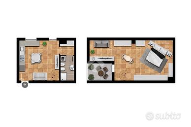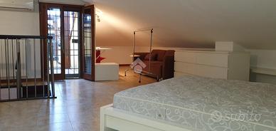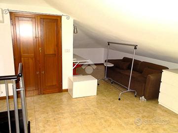 Sopra, una mansarda raccolta: letto matrimoniale, scrivania, un divano scelto con calma.
