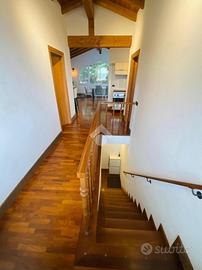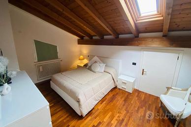 Le travi in legno a vista e il pavimento in parquet creano subito un'atmosfera calda e familiare, perfetta per chi ama gli ambienti dal carattere autentico.