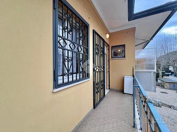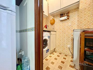 Accediamo all'immobile da una scala esterna. Entrando, l'ingresso fa spazio alla zona giorno, composta dal soggiorno con cucinotto separato e porta finestra che ci permette di uscire sul balcone ad angolo.