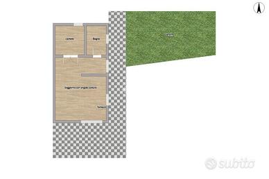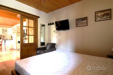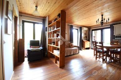 Il pavimento ed il soffitto in legno percorrono tutta la casa. La camera da letto è stata studata di dimensioni idonee ad ospitare un letto matrimoniale ed un piccolo armadio, prediligendo maggior spazio per la zona living. Il bagno è finestrato e dotato di vasca idromassaggio e attacchi per la lavatrice.