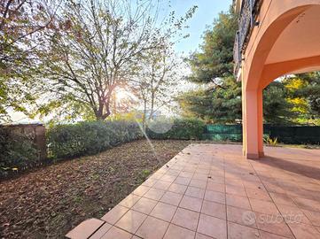 Il giardino privato, impreziosito da un accogliente portico coperto, rappresenta lo spazio ideale per vivere momenti di convivialità all'aperto in ogni stagione, o per offrire un angolo sicuro e confortevole ai propri animali domestici.