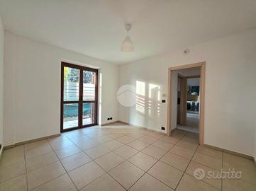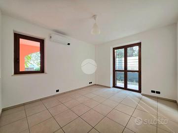 L'ingresso, protetto da porta blindata, si apre su una luminosa zona living con cucina a vista, con accesso diretto al giardino.