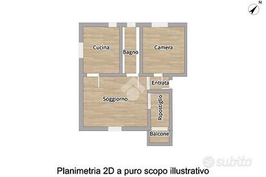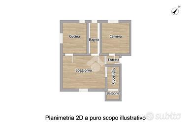 L'immobile vede la seguente distribuzione interna: ingresso, cucina abitabile, soggiorno, camera da letto, bagno finestrato con box doccia e infine un locale ripostiglio con affaccio su balcone.