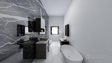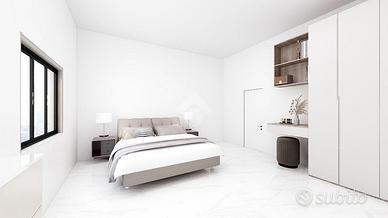 Successivamente troviamo la camera matrimoniale e il bagno finetsrato con vasca. La zona notte presenta un grande ripostiglio pratico per essere trasformato in una comoda cabina armadio.