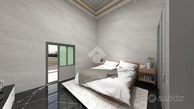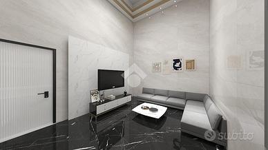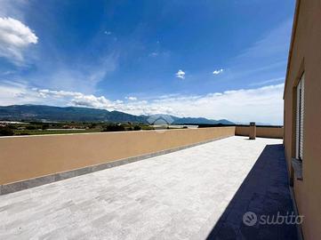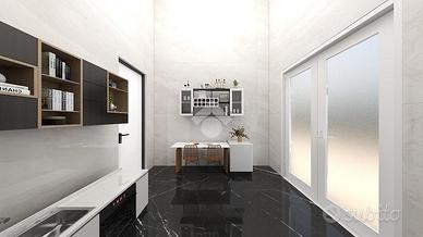Varcato il portoncino e superato l'ingresso, troviamo il soggiorno con la prima porta finestra che consente l'uscita sull'ampio terrazzo. Mentre, separata da un tramezzo, troviamo la cucina anch'essa con porta finestra per l'uscita verso lo sfogo esterno.