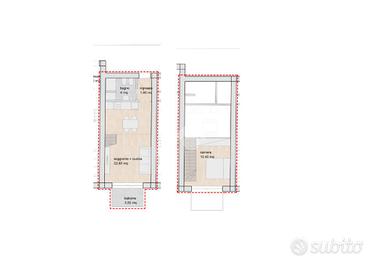 I bilocali, tutti ubicati al primo piano, si caratterizzano per la particolare disposizione interna: l'ingresso ampio si affaccia sulla luminosa zona giorno composta dall'angolo cottura, il living ed un fruibile balcone, oltre al bagno cieco con box doccia. La spaziosa camera da letto invece, è soppalcata raggiungibile da una comoda scala interna. La proprietà si completa con la cantina ad € 5.000,00 ed il posto auto scoperto ad € 15.000,00.
