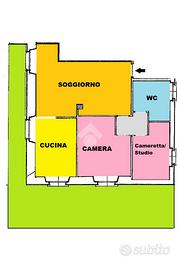 Varcando il portoncino d'ingresso siamo accolti direttamente nella zona giorno, un ambiente luminoso attiguo al cucinotto separato e semi abitabile. La zona notte invece, totalmente disimpegnata, gode di una camera, di una cameretta/studio e di un bagno finestrato completo di box doccia. Completa la soluzione il posto auto coperto e la porzione di giardino ad uso esclusivo e perpetuo.