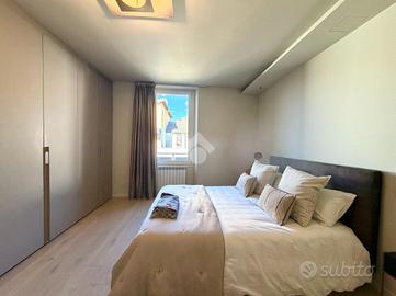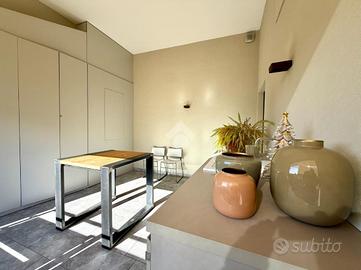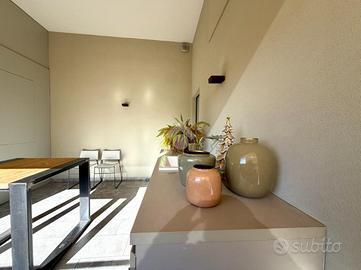 L'accesso all'appartamento avviene tramite una scala esclusiva che conduce a una splendida e ampia terrazza con travi a vista, uno spazio riservato e vivibile ideale per momenti di relax all'aperto. La terrazza è valorizzata da un'ampia armadiatura su misura e da una funzionale zona lavanderia con mobile di design completo di lavandino e predisposizione per lavatrice e asciugatrice.
