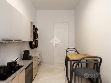 I pavimenti in marmo originale sono stati trattati per valorizzarne l'eleganza senza rinunciare alla praticità. L'intervento di ristrutturazione ha interessato anche gli impianti elettrico e idraulico, le porte interne appena sostituite e il bagno.