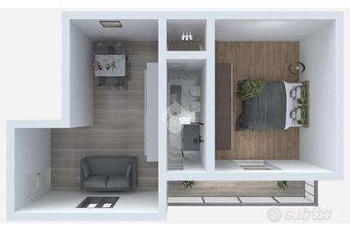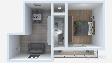 L'ingresso si apre su un'ampia e luminosa zona giorno open space, uno spazio accogliente e ben organizzato che permette di integrare armoniosamente l'area living con la zona pranzo, creando un ambiente ideale sia per la vita quotidiana sia per momenti di convivialità. Un comodo disimpegno separa in modo razionale la zona notte, assicurando privacy e una distribuzione degli spazi ottimale. Qui troviamo un bagno padronale, completo di box doccia, progettato per offrire relax e praticità, e una spaziosa camera da letto matrimoniale, ben illuminata e facilmente arredabile, pensata per garantire il massimo comfort.