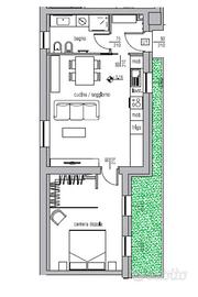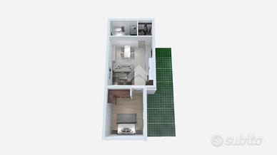 Nello specifico parliamo di un bilocale posto al pian terreno, composto da: un ingresso, un bagno finestrato, una cucina open space sulla zona giorno, di comode metrature, una camera matrimoniale con una propria cabina armadio.