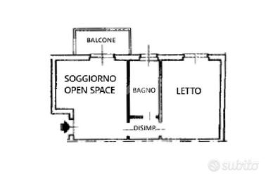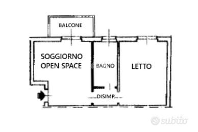 Ingresso sulla zona giorno openspace con cucina a vista in affaccio sul balcone, una camera da letto matrimoniale ed il bagno finestrato con doccia.