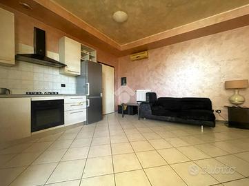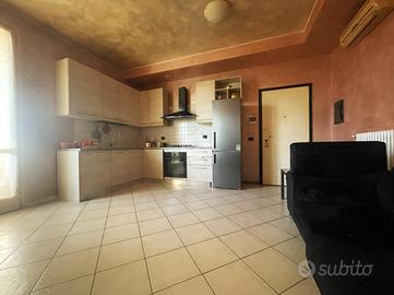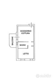 Ingresso sul soggiorno openspace con cucina in affaccio sul terrazzino, camera da letto matrimoniale, bagno finestrato con vasca.