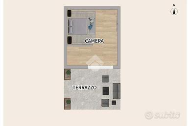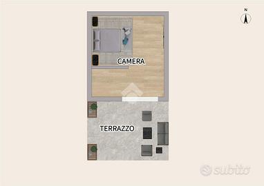L'abitazione si compone di soggiorno con angolo cottura, bagno con doccia e scala interna che conduce al piano superiore, dove si trovano una camera matrimoniale e un terrazzo vivibile, perfetto per momenti di relax all'aperto.